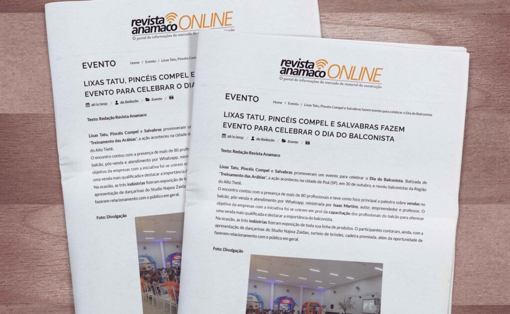 As indústrias Lixas Tatu, Pincéis Compel e Salvabras promoveram, no dia 30 de outubro de 2023, um evento destinado aos profissionais balconistas do Alto Tietê, SP, no salão de Festas Caramelo, na cidade de Poá. O evento gratuito contou com a presença de mais de 80 profissionais e teve como foco principal a palestra ministrada por Isaac Martins, autor de diversos livros, empreendedor e professor, com foco em vendas no balcão, pós-venda e atendimento por whatsapp. O objetivo das empresas parceiras foi de se unirem em prol de capacitar os profissionais do balcão para uma venda mais qualificada, devido à alta demanda de final de ano, e destacar a importância desse profissional, que, além de vender, também compra, entrega e gerencia todas as atividades das lojas. Denominado “Treinamento das Arábias”, o evento teve a exposição de toda linha de produtos das empresas participantes, apresentação de dançarinas do Studio Najwa Zaidan, sorteio de brindes, cadeira premiada e muito networking. Leia mais em: https://www.calameo.com/read/005983603099ab02e070c