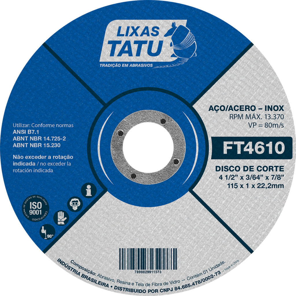 Indicado para corte de aço inox/ferro em serralherias, manutenções e reparos industriais. Disponíveis para aplicações conforme normas ABNT 15230, os discos podem ser utilizados em máquinas portáteis ou de bancadas.